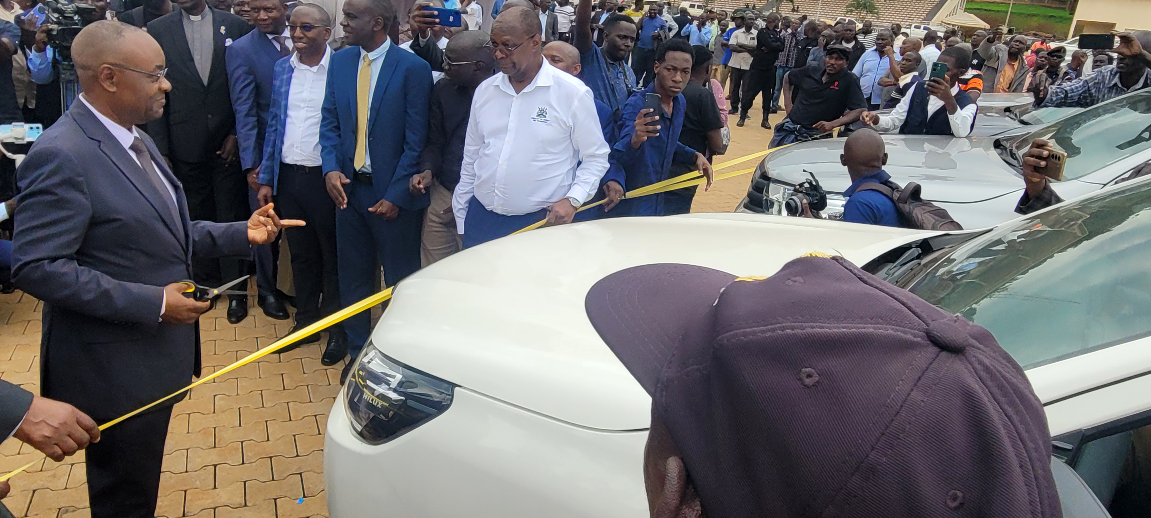 Katikkiro wa Uganda Robihan Nabbanja eyakiikiriddwa Minisita wa gavumenti ez’ebitundu Raphael Magyezi mu kukwasa mmotoka zino eri abakawatibwako ku mukolo ogwabadde ku kisaawe e Kololo ku Lwokutaano yagambye nti zigendereddwa kwongera maanyi mu kulondoola enteekateeka za gavumenti mu bitundu .