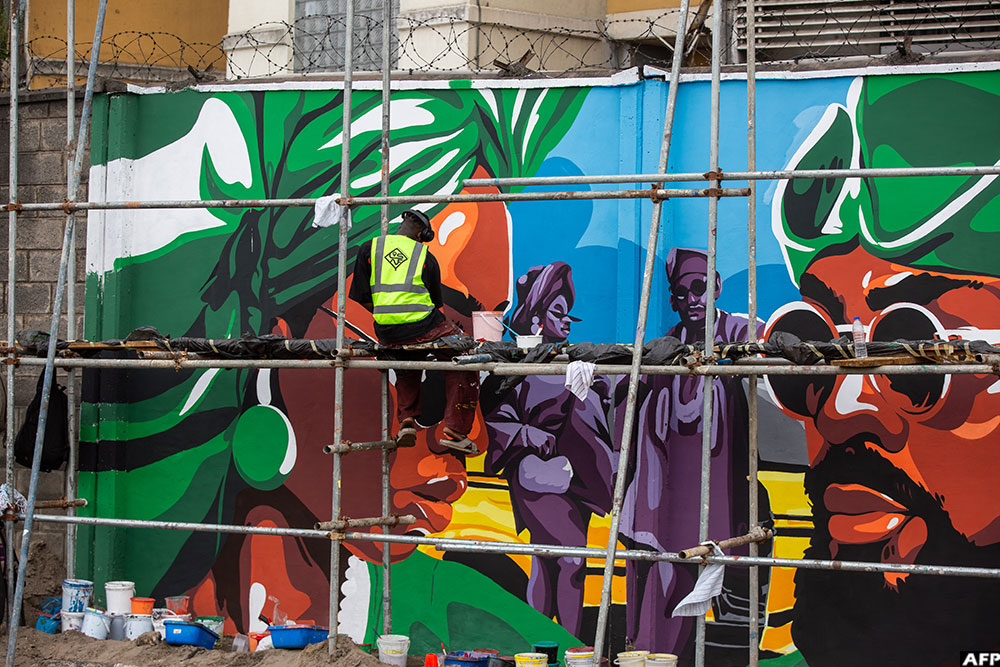 Pedestrians walk past a mural on Ozumba Mbadiwe Avenue. (AFP)