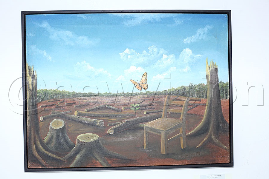 Among the standout pieces was Empty Seat in the Forest by Biira Shalote Mayani. It is a haunting oil on canvas work depicting a solitary chair amidst a devastated forest, symbolizing the absence of collective responsibility in defending the environment. The piece quickly became a highlight of the exhibition, sparking animated discussions among visitors.