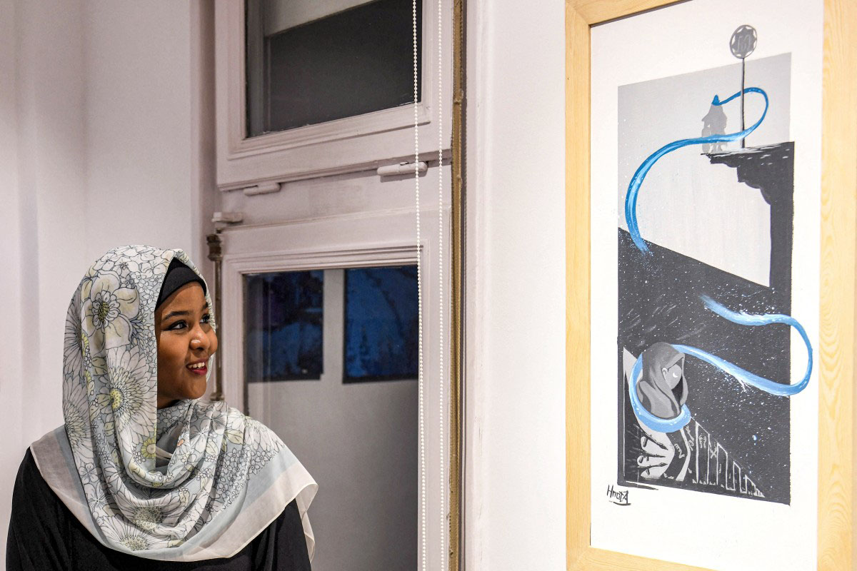 Sudanese visual artist Fatima Ismail looks at one of her creations during an exhibition organised by Sudanese artists at the Goethe institute in the Egyptian capital Cairo on November 26, 2023. AFP