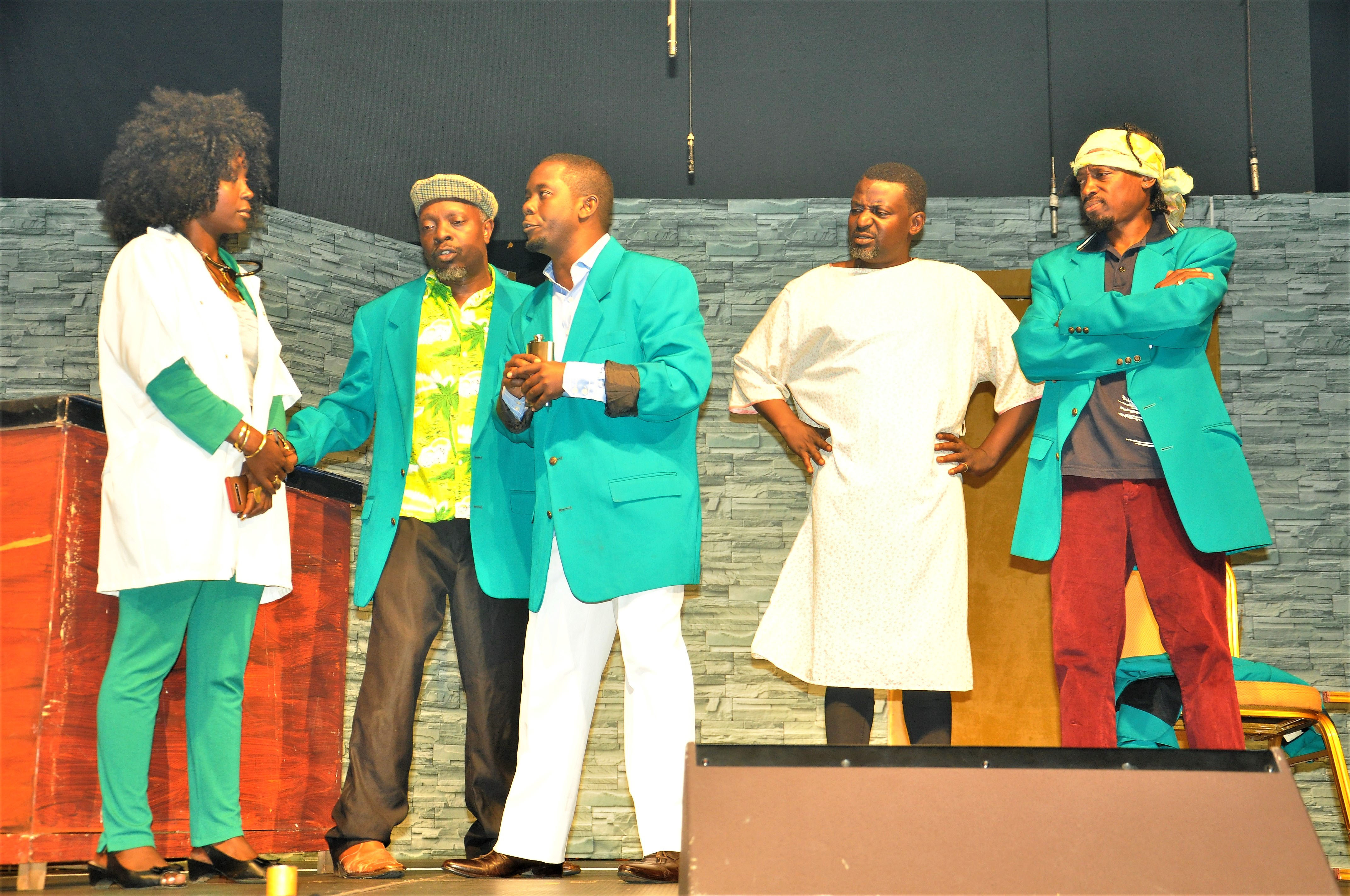 Fun Factory members Anne Kansiime, Raymond Rushabiro, Richard Tuwangye, Simon Base Kalema and Frobisher Lwanga on stage before COVID-19