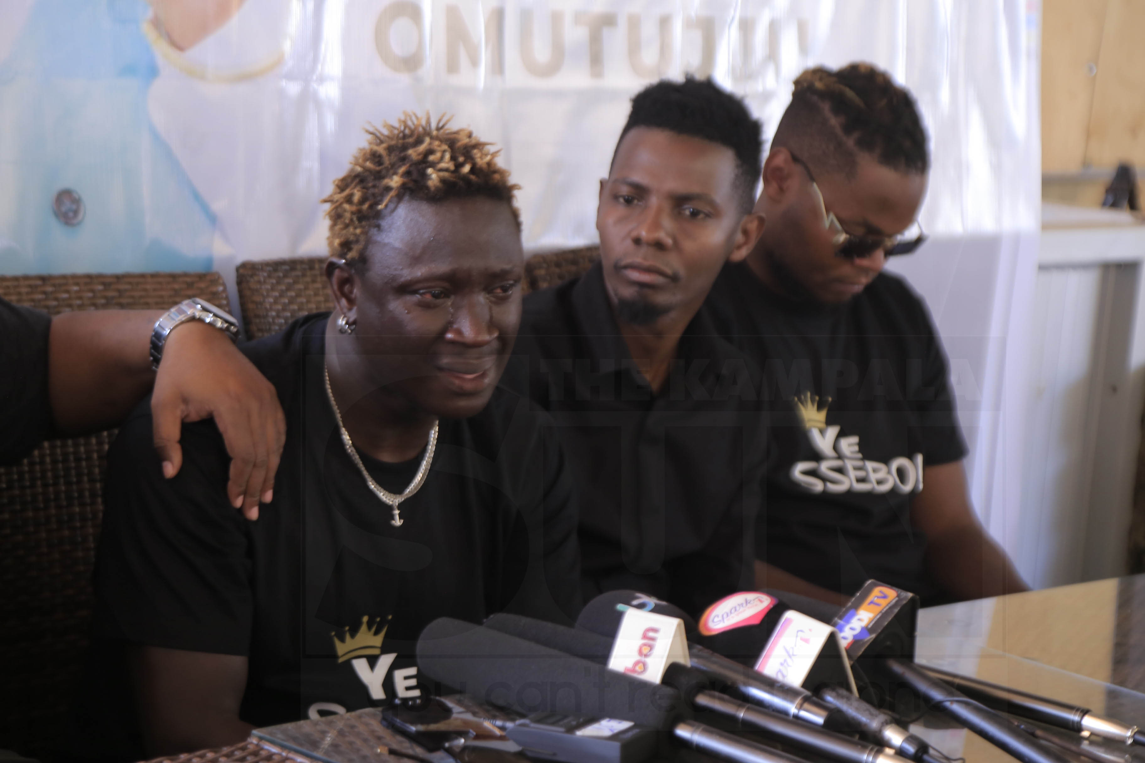 Singer Gravity Omutujju being consoled during a press conference at Cubana Lounge in Munyonyo on October 13, 2022. Photo by Dickson Ndugwa