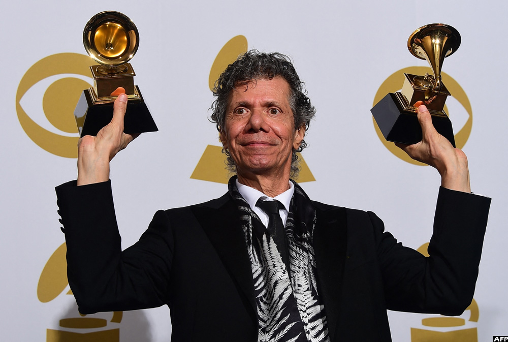 February 8, 2015: Chick Corea holds his Grammy after winning Best Jazz Instrumental Album Trio, "Fingerprints" during the 57th annual Grammy Awards in Los Angeles, California. (AFP)