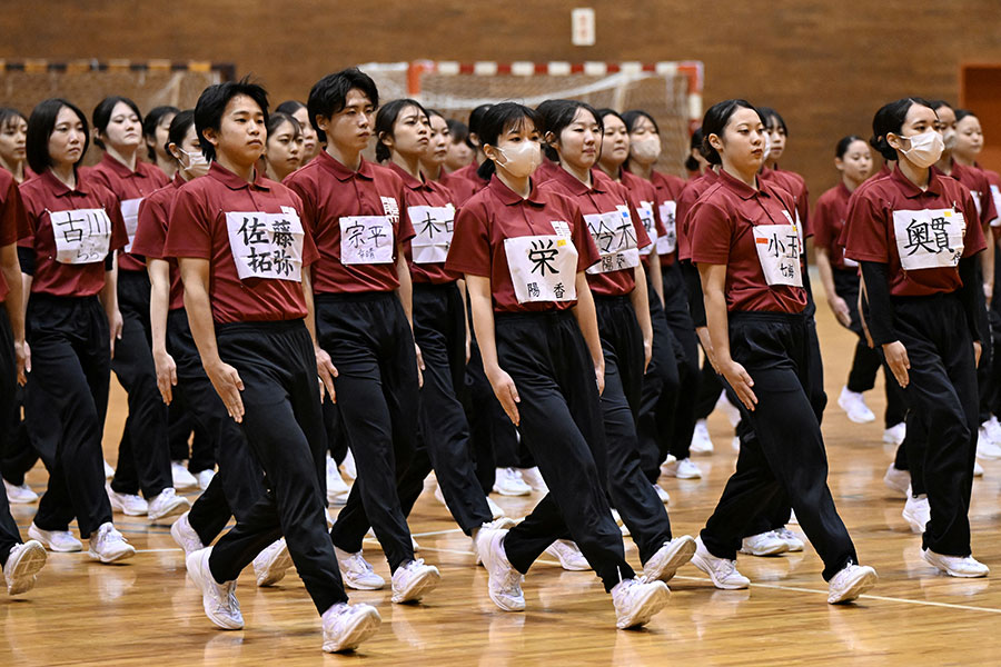 Shoes squeaking in perfect unison, dozens of Japanese students move in formation through a Yokohama sports hall in training for a synchronised walking performance expected to draw thousands.
