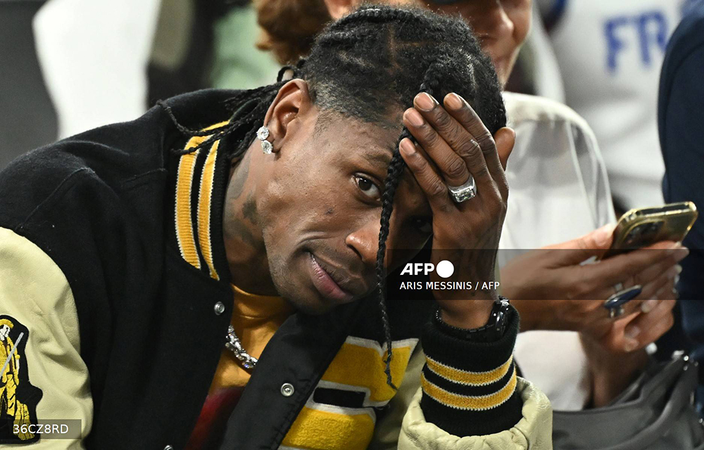 US rap artist Travis Scott gestures as he attends the men's semi-final basketball match between France and Germany during the Paris 2024 Olympic Games at The Bercy Arena in Paris on August 8, 2024. (Photo by Aris MESSINIS / AFP)