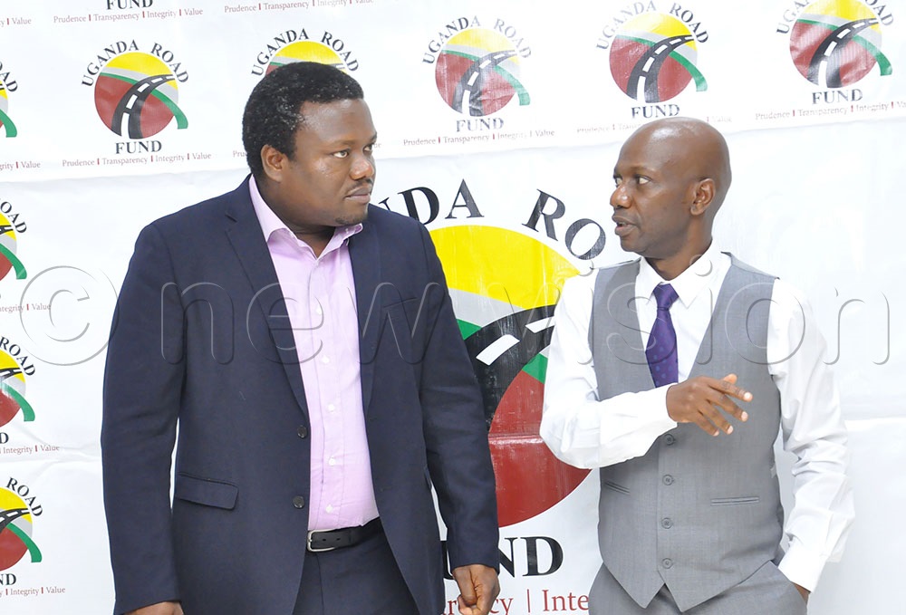 Ndlaluhlaza Nhlonipho Celumusa Ndwandwe (L) Minister for Public Works and Transport from Eswatini interacts with Andrew Grace Naimanye ED Uganda Road Fund after a meeting at the fund offices. Nancy N