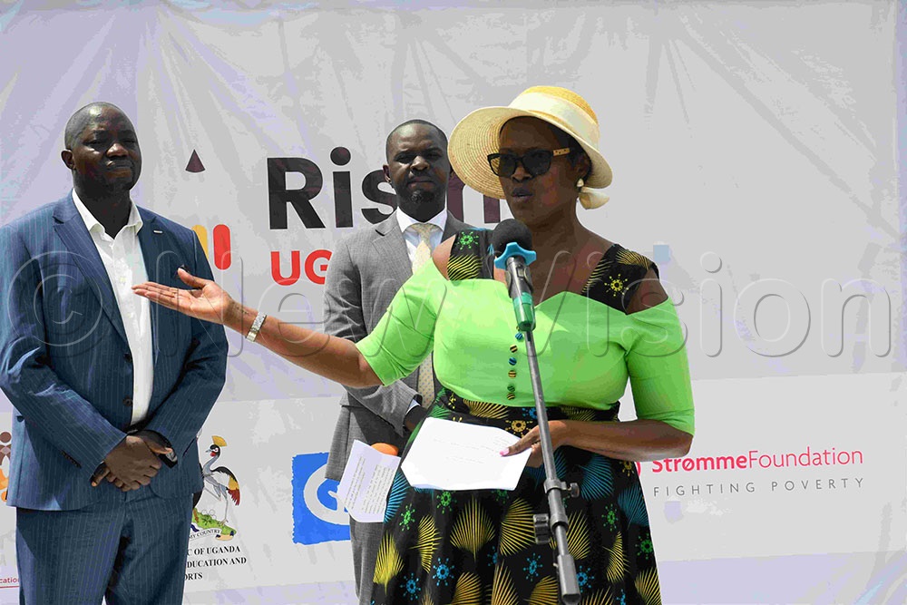 State minister for primary health, Margaret Muhanga addressing guests at the launch ceremony at Buteme Light Primary School in Kamuli (Photos by Denis Nsubuga)