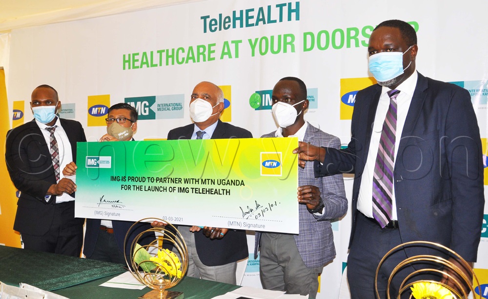 (L-R) Peter Ntege, MTN’s Sen Somdev, IMC’s Sukhmeet Sandhu & Joel Oroni, and KCCA’s Daniel Okello during the launch of telehealth services. Photo by Nancy Nanyonga