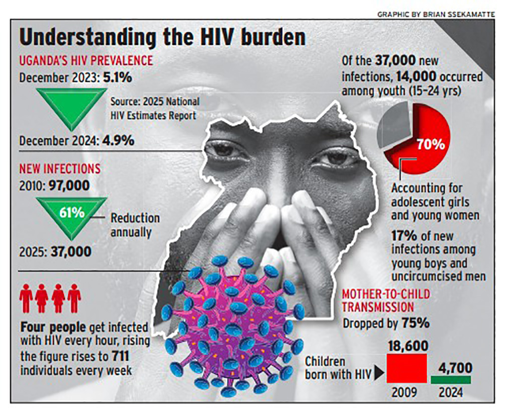 According to the 2025 National HIV Estimates Report, Uganda’s HIV prevalence has declined from 5.1% (December 2023) to 4.9% (December 2024).