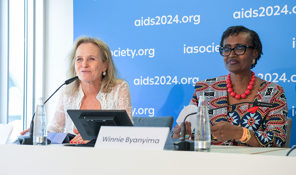 Sharon Lewin, the International Aids Society (AIS) President and UNAIDS Executive Director, Winnie Byanyima, at the official Opening press conference of AIDS 2024. (Courtesy)