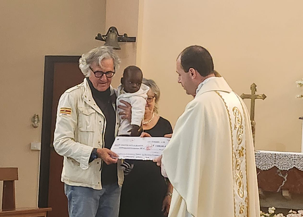 Uganda’s Honorary Consul in Italy, Albrieux Giacomo receives a cheque from Padre Stefano Bisio a church leader in Italy to partially support treatment of Walukale and a dispensary project at Ruhija in Kabale. (Courtesy Photo)