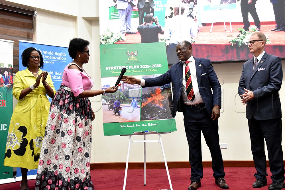 Lorna Magara, the chairperson of council of Makerere University, looking on as Muhanga, the state minister for Health for Primary Healthcar, hands over a microphone to Prof. Barnabas Nawangwe, vice chancellor of the Makerere University, as the representative of the US government looks on. This was during the launch the strategic plan 2025-2030 for the school of public health at Makerere University during the 70 years of public health training at the University. (Photo by Simon Peter Tumwine)