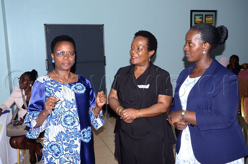(L-R) Dr. Janviere Ndirahisha, Regional Director of ICGLR-RTF, Dora Byamukama, Regional training facility Research + Knowledge Production Expert/Senior Consultant (ICGLR-RTF) and Sharon Asiimwe, Administration and Program Officer (ICGLR-RTF) interact during a stakeholders’ engagement on mental health, psychosocial support and peacebuilding held at Imperial Royale in Kampala on Monday January 20, 2025. (Credit: Colleb Mugume)