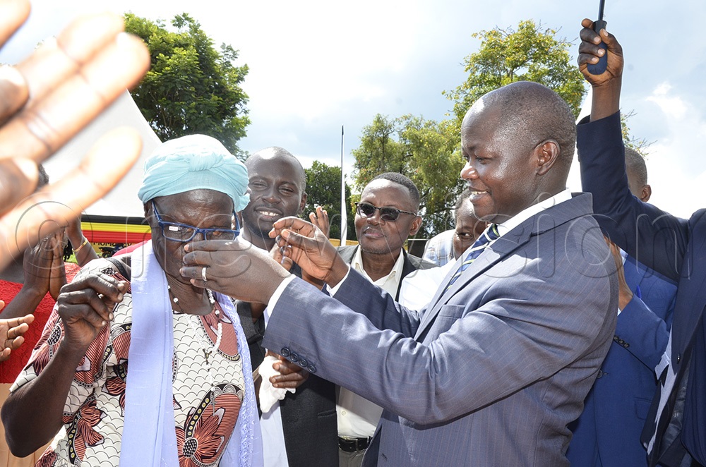 Masindi DPC Pensive Ukasima helping a resident put on her newly acquired reading spectacles. (Photo by Yosam Gucwaki)