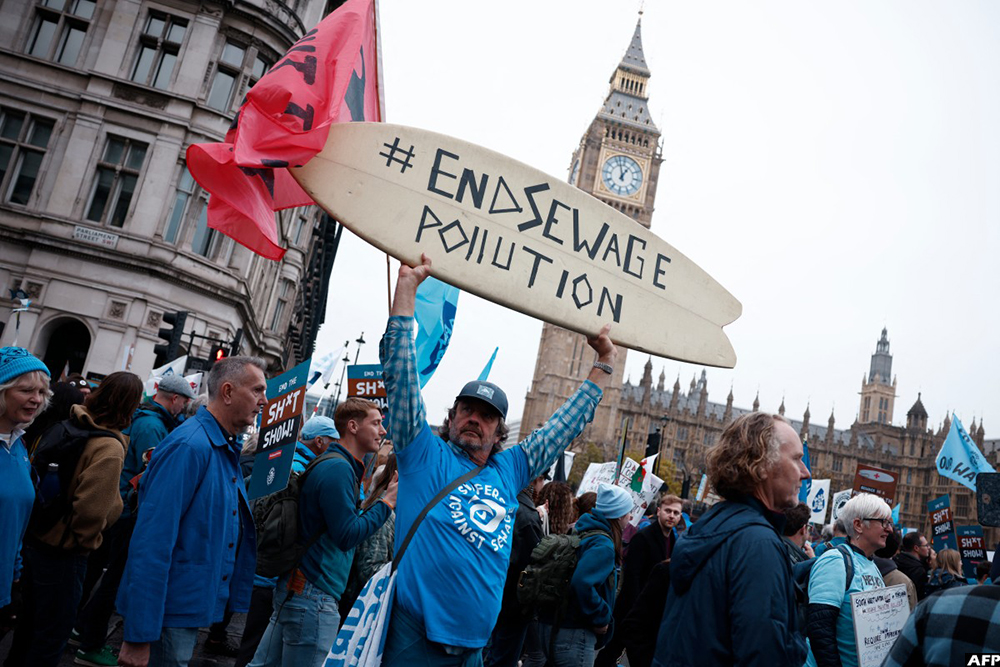 People hold placards as they take part in a "March for Clean Water" in London on November 3, 2024, calling for the government to "stop the poisoning of Britain's waters". (AFP)