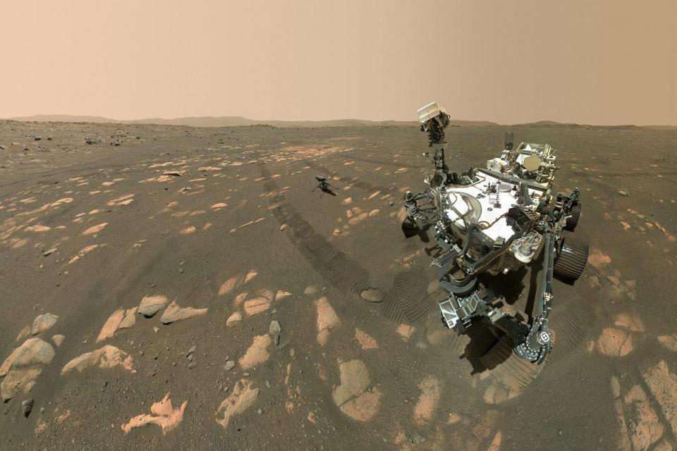 This NASA photo shows the Perseverance Mars rover in a selfie with the Ingenuity helicopter, seen here about 3.9 metres from the rover. Photo: Handout, NASA, JPL-Caltech/MSSS, AFP