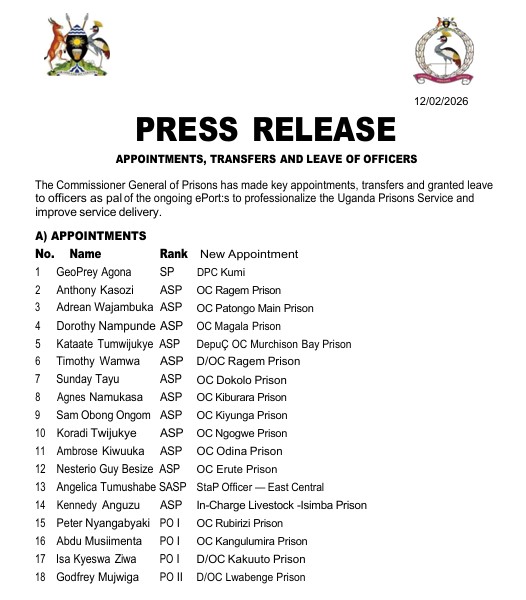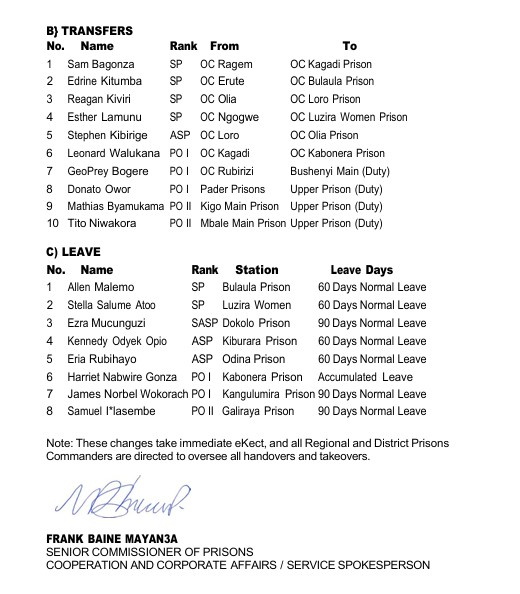 Among the transfers include Sam Bagonza from Ragem Prison to Kagadi Prison and Edrine Kitumba from Erute Prison to Bulaula Prison.