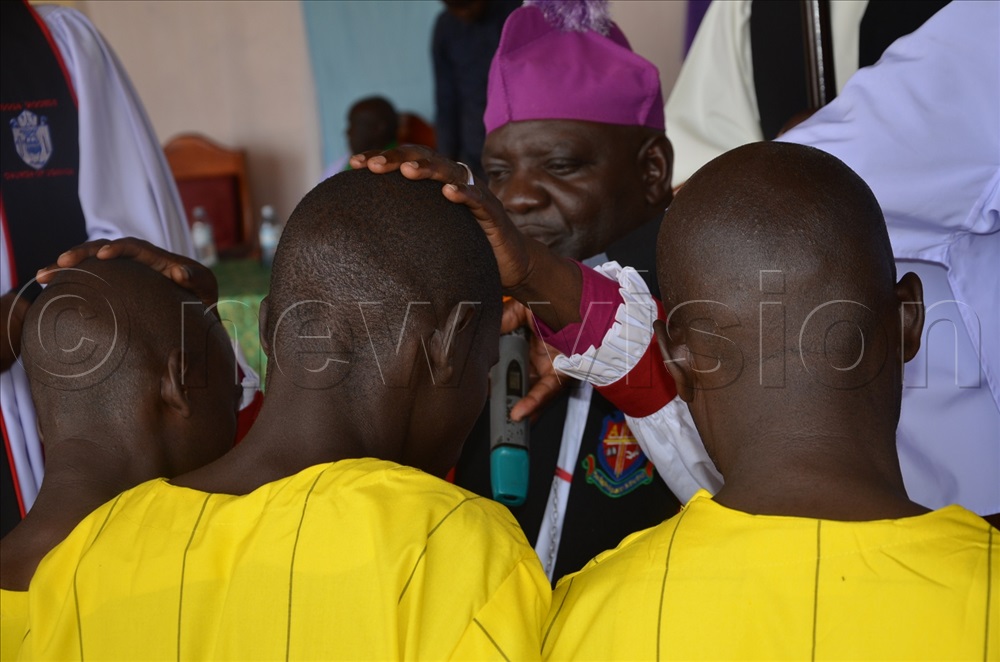 Busoga Diocese bishop the Rev. Dr. Paul Samson Naimanhye confirming some of the 48 inmates during his pastoral visit at Kirinya prisons in Jinja city on Thursday. Photos by Jackie Nambogga
