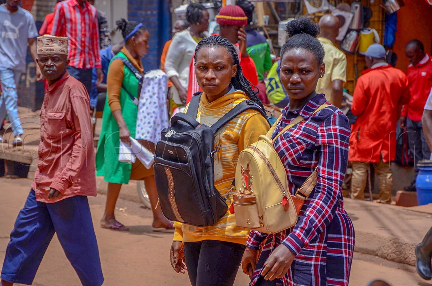 Ladies walking along Namirembe Road with their bags in front. It is common to see travellers carrying their backpacks in front. (Photo by Colleb Mugume)