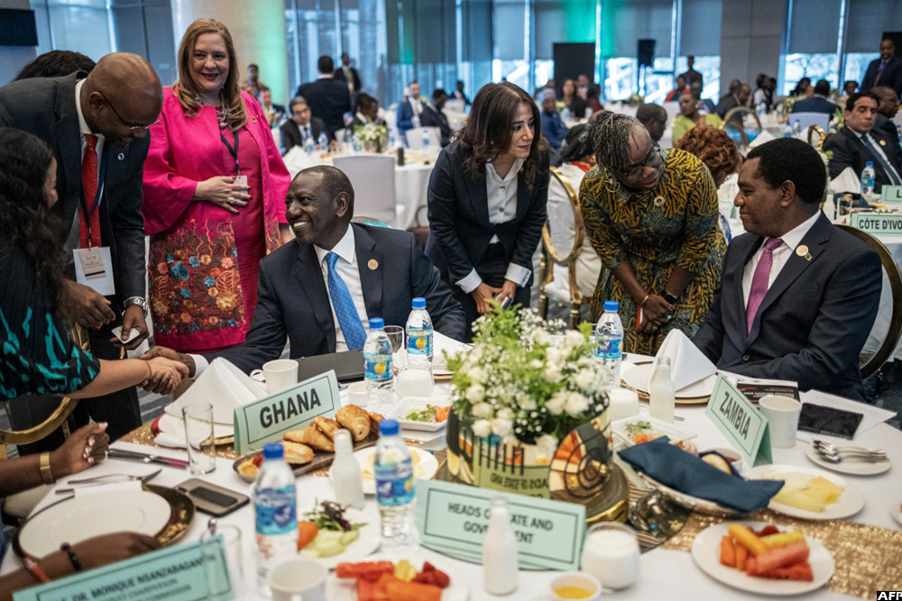 CAPTION: President of Kenya William Ruto (C) and President of Zambia Hakainde Hichilema (R) speak with members of their staff and guests during an event before the opening ceremony of the 37th Ordinary Session of the Assembly of the African Union in Addis Ababa on February 17, 2024. (AFP)