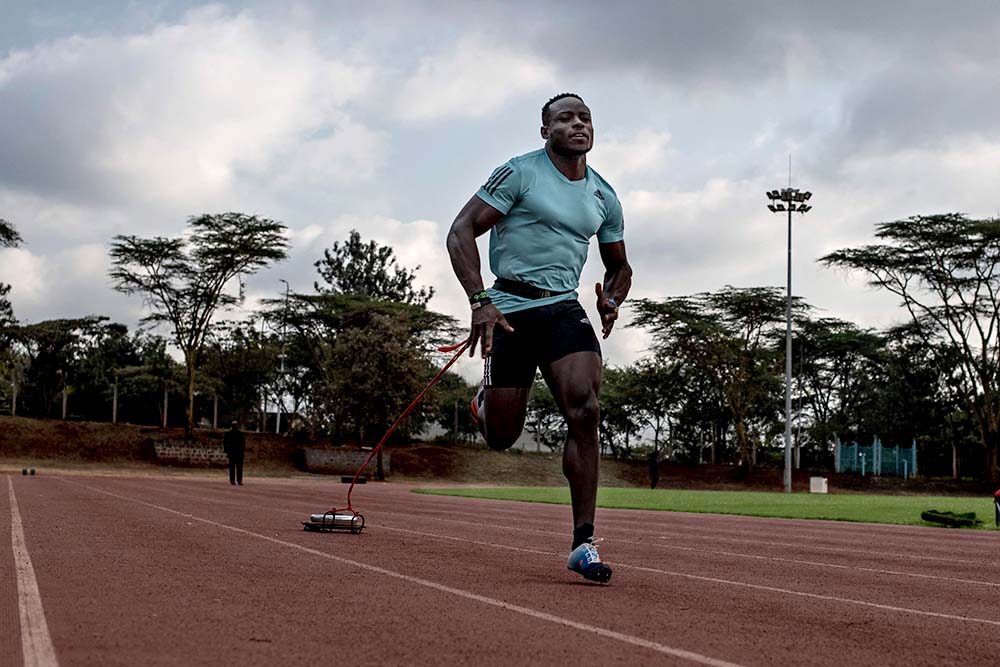 Kenya's sprinter Ferdinand Omanyala runs during a training session at the Kasarani stadium in Nairobi on June 30, 2022. (AFP)