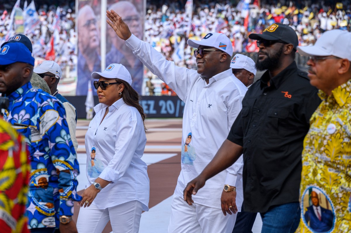 Incumbent President of the Democratic Republic of the Congo and presidential candidate Felix Tshisekedi of the UDPS political party (C) waves at the Stade des Martyrs during his first campaign rally.