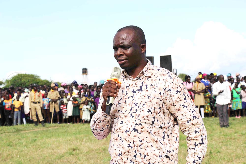 Geoffrey Ocen Amolatar district chairperson speaking to the public. (Photo by Hudson Apunyo)