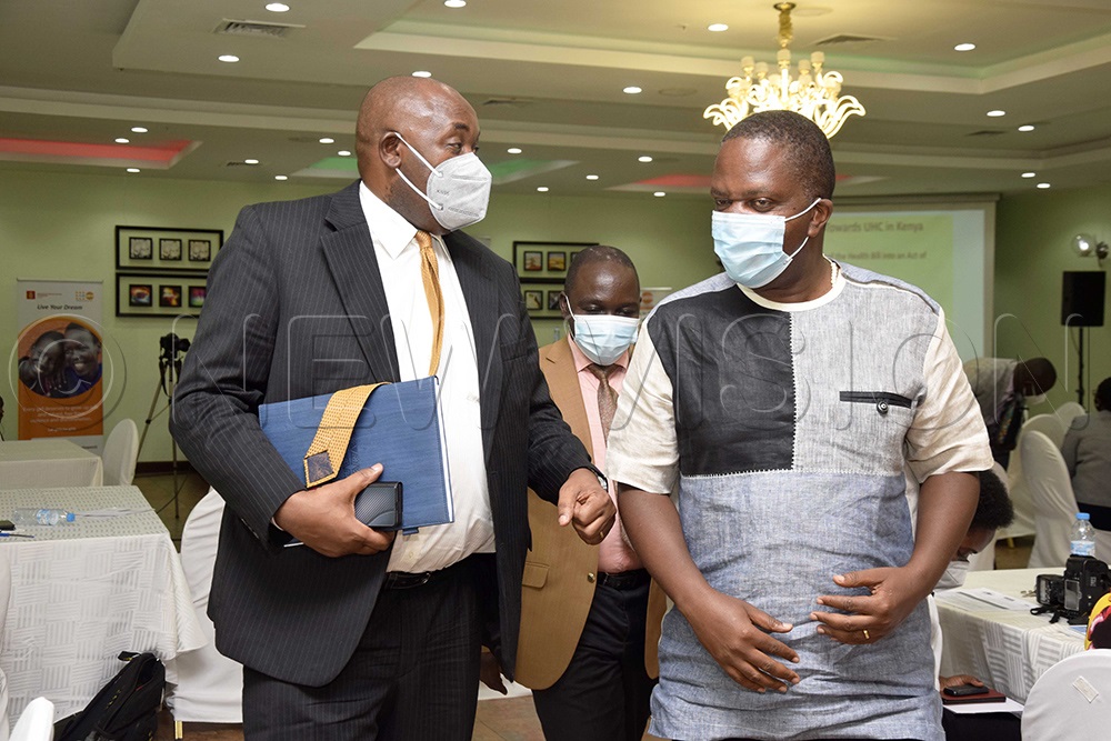 Dr. Chris Baryomunsi interacting with Dr. Nicholas Kamara at Imperial Royale Hotel after the Network of African Parliamentary Committee of Health meeting on October 28,2021. Photos by Simon Tumwine