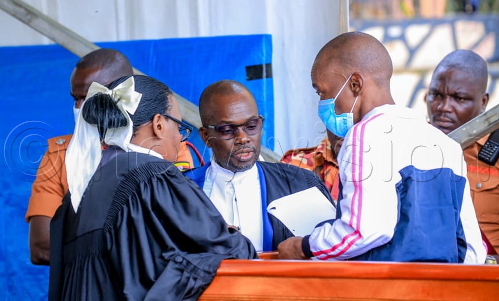 Okello (right) who is accused of murdering four toddlers at Ggaba Early Childhood Development Programme, consulting with his lawyers, Kumbuga and Awelo. This was during High Court sitting at Ggaba Community Church on Friday. (Credit: Moses Nsubuga)