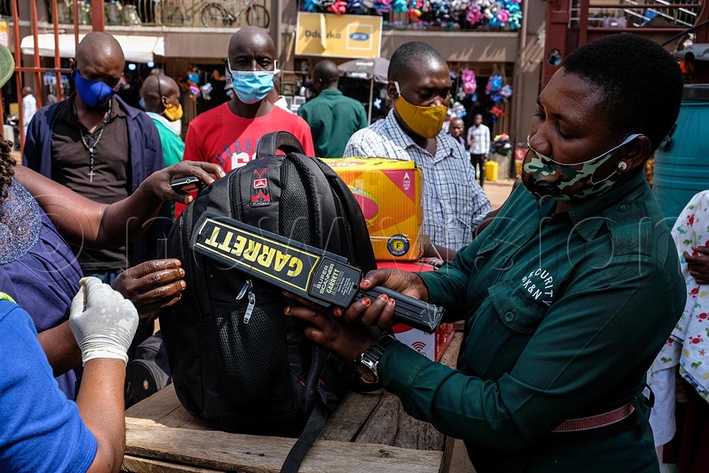 Bus security officer checks passenger’s luggage using a mental detector before accessing the bus at Kisenyi bus terminal in Kampala. (Credit: Hajarah Nalwadda)