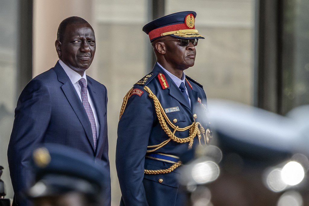 Prime Minister of Ethiopia Abiy Ahmed (unseen), President of Kenya William Ruto (L) and Chief of Kenya Defence Forces General Francis Ogolla (R) look on while inspecting a guard of honour by members of the Kenya Defence Forces (KDF) during his official state visit to State House in Nairobi, on February 28, 2024. A Kenyan military helicopter carrying top brass including the country's defence chief General Francis Omondi Ogolla crashed on April 18, 2024, police said. (Courtesy Photo)