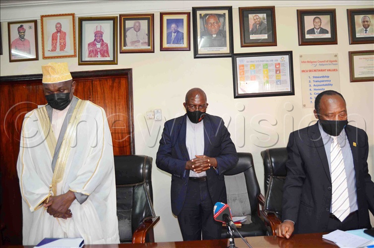 Msgr Charles Kasibante (centre) leads a prayer. Besides him is Sheikh Waiswa (left) and Archbishop Daniel Matte. Photos by Mathias Mazinga