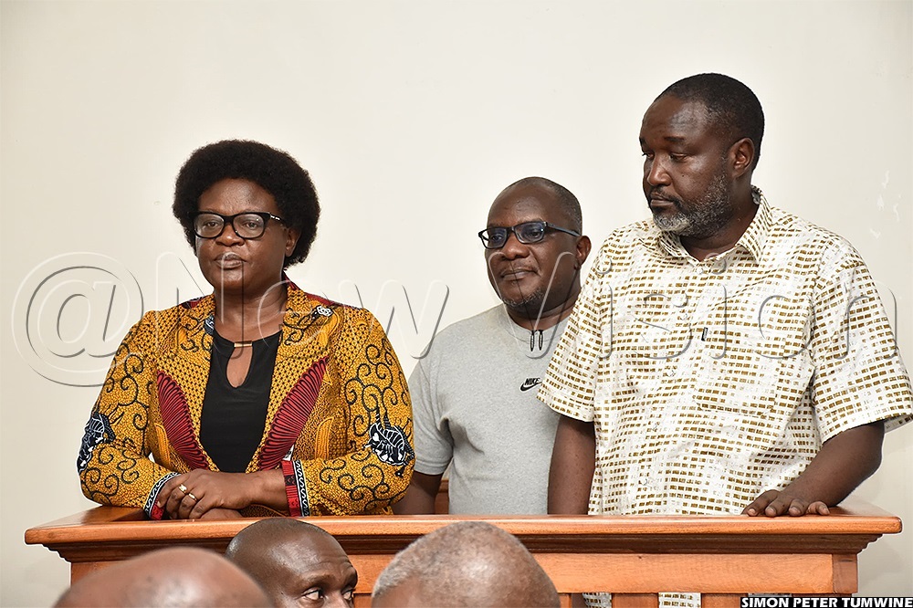 Dismissed former KCCA officials, from left, executive director Dorothy Kisaka, her deputy Eng. David Luyimbazi and public health director Dr Daniel Okello standing in the dock at Kasangati Chief Magistrates' Court in Gayaza, Wakiso district on October 18, 2024. (Credit: Simon Peter Tumwine)