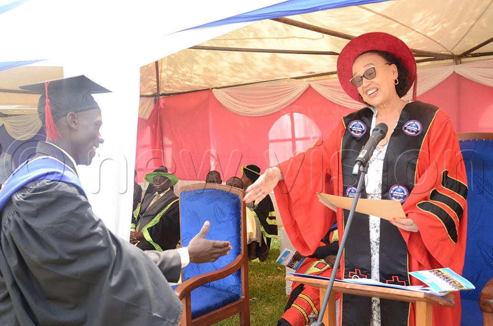 Uganda Pentecostal University Chancellor Dr Maggie Kigozi congratulates one of the graduates as she presided over the 18th graduation ceremony at University's main campus in Fort Portal City, Kabalore