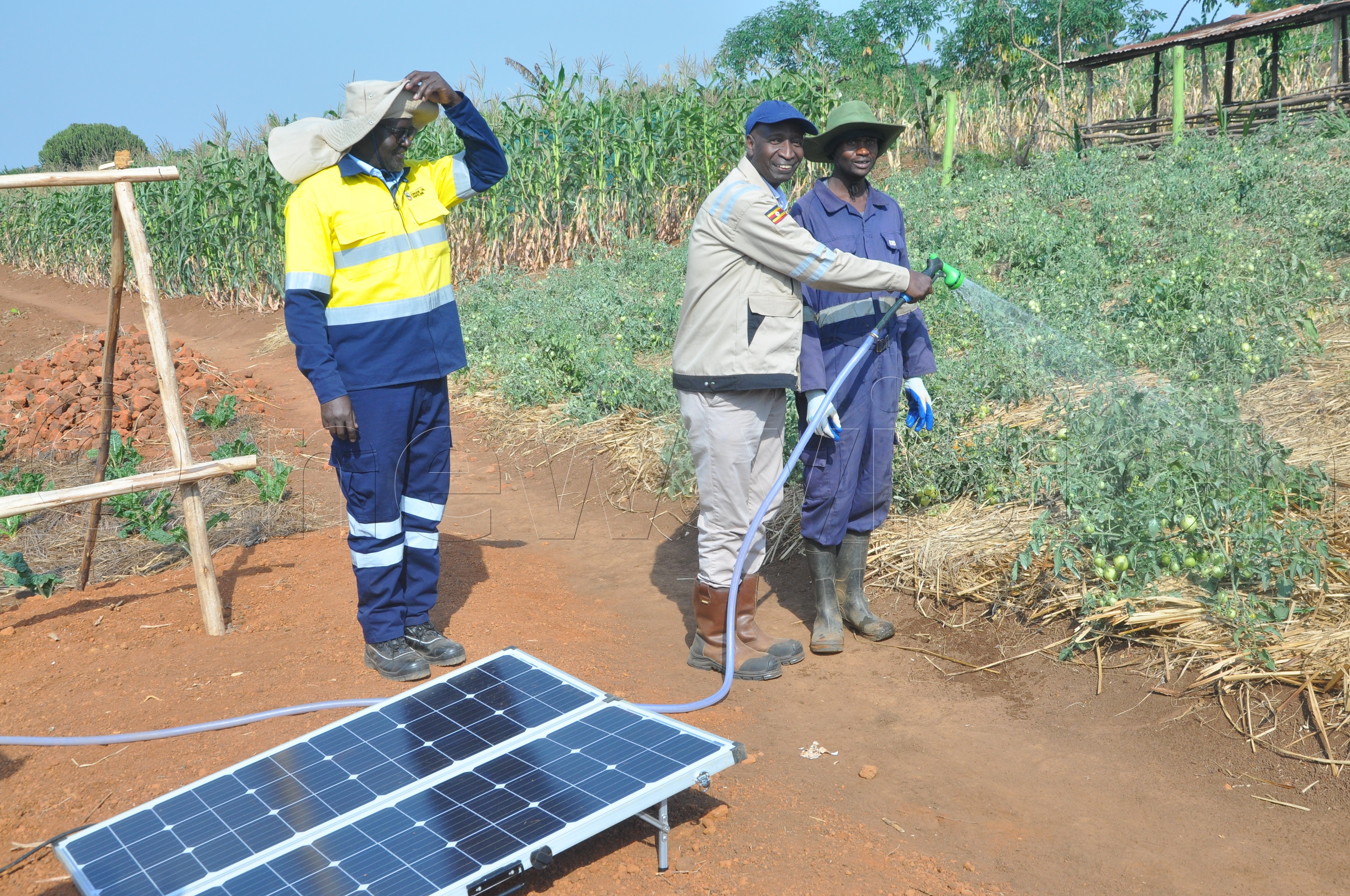 Rubondo trying out the solar water irrigation system being used by project affected persons in Sembabule District. (Photo by John Odyek)