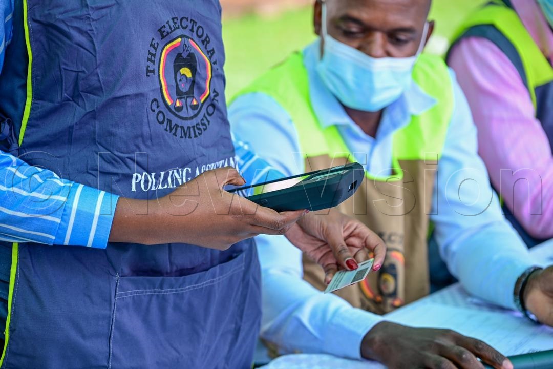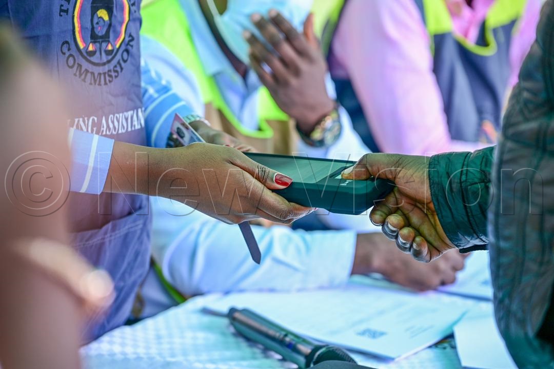 An electoral commission official shows the voters verified face after a facial recognition exercise. (Credit: Miriam Namutebi)