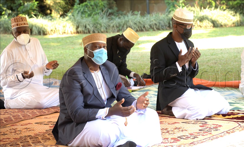 Prince Kassim Nakibinge (Left) and others during the Eid al-Adha prayers at Prince Nakibinge's residence in Kibuli on July 20, 2021. Photos by Maria Wamala