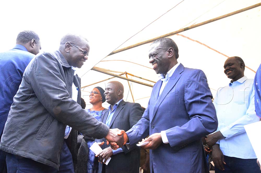 Patrick Amuriat Forum for Democratic Change party president greeting Kiiza Besigye during the burial of Sarah Eper. (Photos by Godfrey Ojorey)u