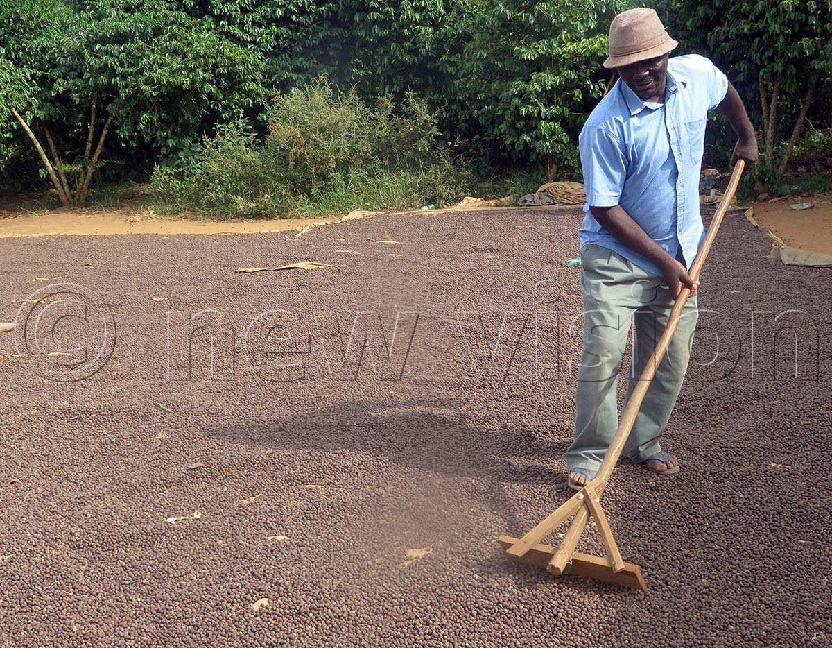 A farmer sun-drying coffee on tarpaulins. Prices have been supported by the quality and good outturn of the coffee beans. (File photo by Stephen Nuwagira)