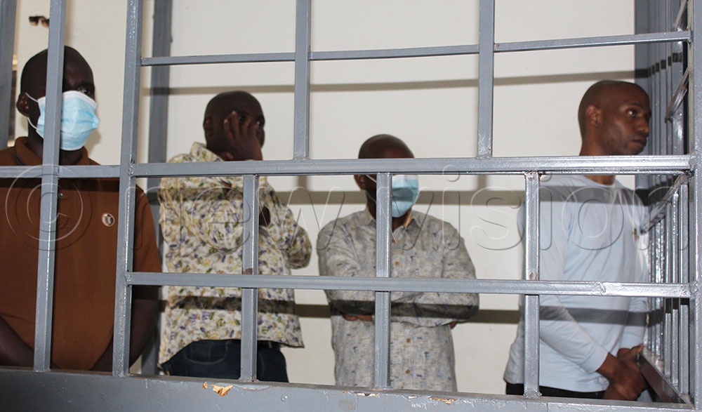 (L-R) In the dock at the General Court Martial at Makindye in Kampala is Nassoni Bwambale Ndyanabo alias Hassan, herbalist Ibrahim Sabiti, Mohammed Ali Mugabe alias Bashir, and bodaboda rider Tonny Kasule during the hearing of their bail application. (Credit: Douglas Mubiru)