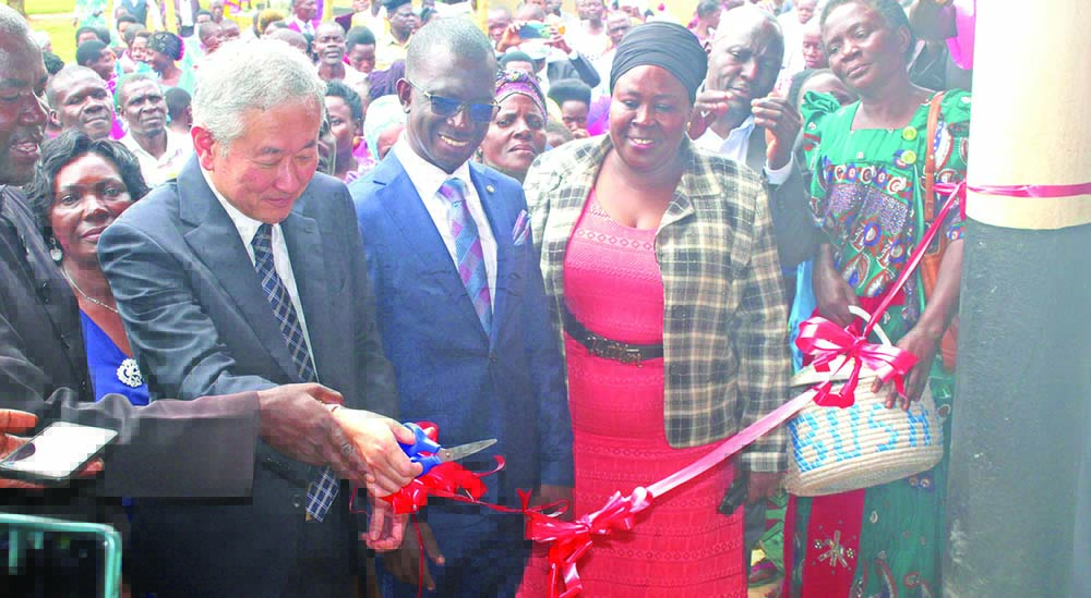 Rev. Mugolo and Yoshinori cut the tape to commission Busala Primary School buildings in Luuka .(Photo by George Bita)