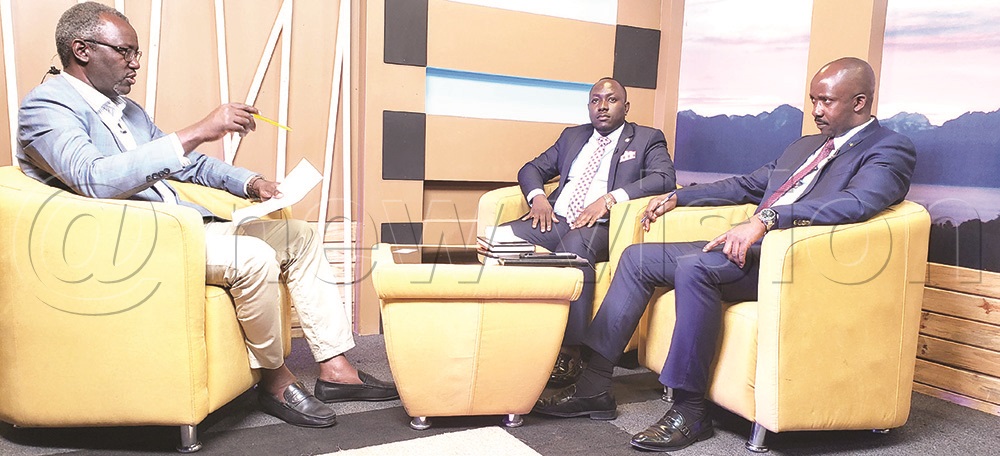 Busharizi (left), Ssemaganda and Kaboyo during Urban TV’s special programme on the financial year 2022/23 budget on Wednesday.