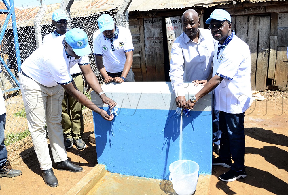 Moses Dumba (second right), Kayunga district RDC, Eng John Twinomujuni (right) commission the public stand post as other water experts look on. (Photo by Juliet Kasirye)