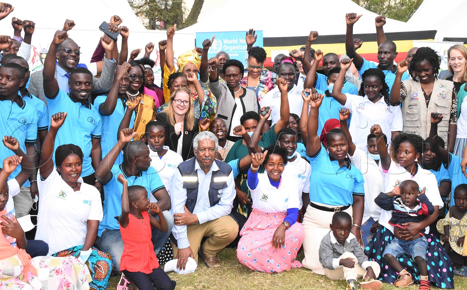 Health minister Dr Jane Ruth Aceng, US Ambassador Natalie Brown, WHO representative Dr Yonas Tegegn Woldemariam and other dignitaries with Ebola survivors in Mubenda. Photo by Luke Kagiri