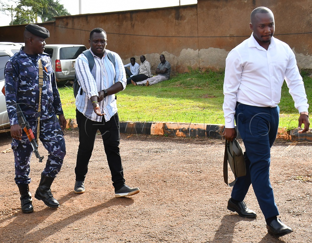 Donald Francis Wangoli (2nd right), a staff surveyor, and Jovan Woniala (left), a graduate trainee at the Ministry Zonal Office being led by Policemen to a vehicle to be taken to the Jinja regional IGG office for further investigation after their arrest on April 15th. (Photo by Donald Kiirya)