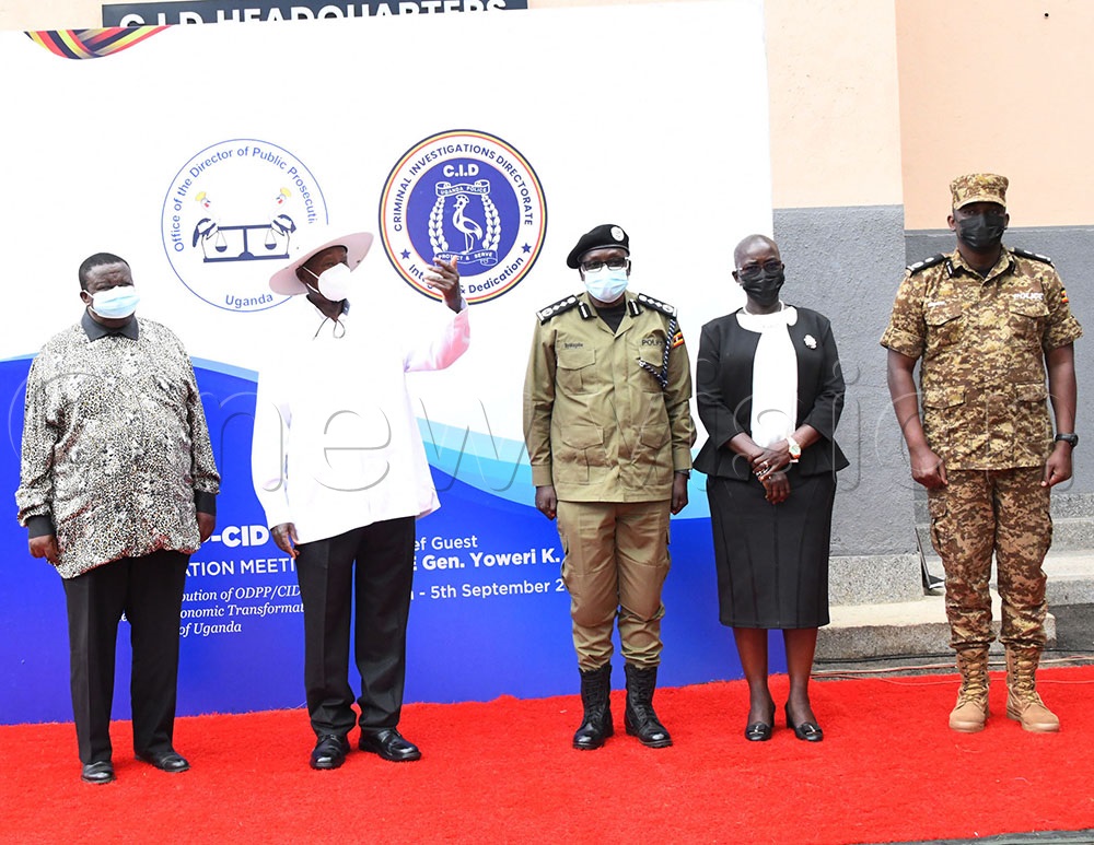 President Yoweri Museveni (wearing a hat) with Internal Affairs Minister General Kayinda Otafire (left), IGP Abas Byakagaba (centre), the DPP Lady Justice Jane Frances Abodo and the Director CID AIGP Tom Magambo Rwabudongo at the climax of the two- day ODPP-CID Coordination meeting at CID headquarters, Kibuli on Thursday September 5, 2024. (Credit: Mpalanyi Ssentongo)
