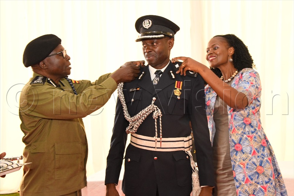 Inspector General of Police Abbas Byakagaba decorating AIGP David Wasswa, Director Counter terrorism during the pipping ceremony of 12 Police officers on December 5, 2024. (Photos by Mpalanyi Ssentongo)