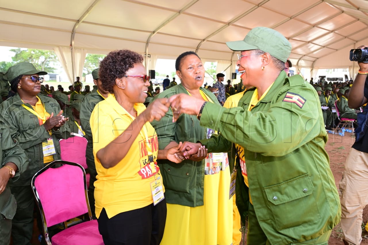 Health Minister Jane Ruth Aceng (left) with Milly Babalanda (centre) the Minister for the Presidency.