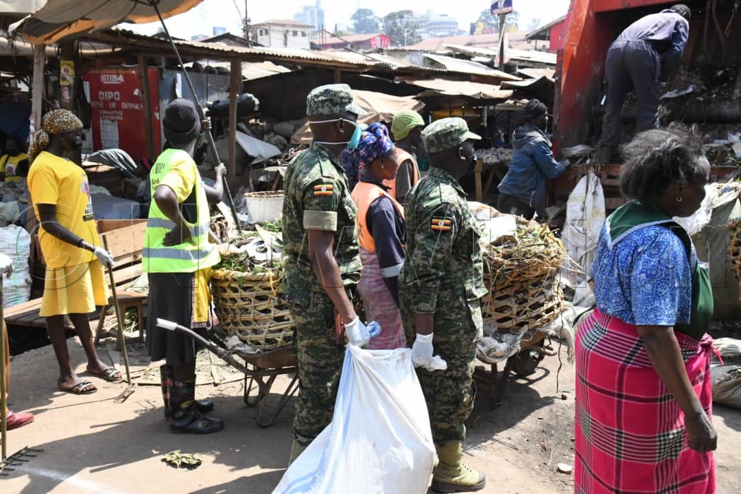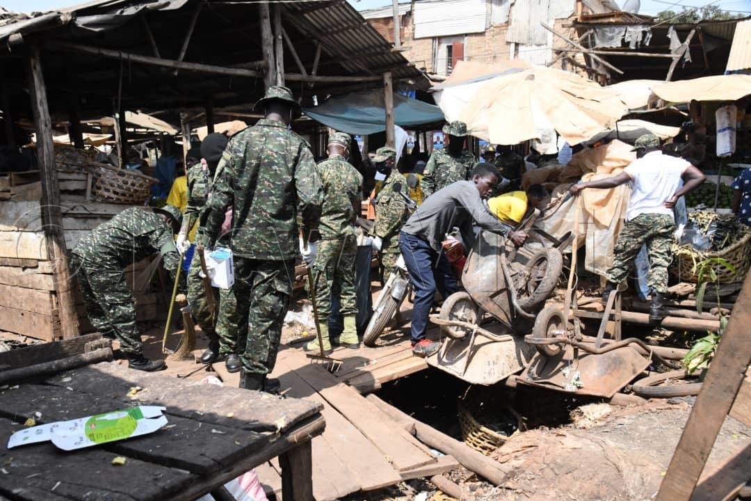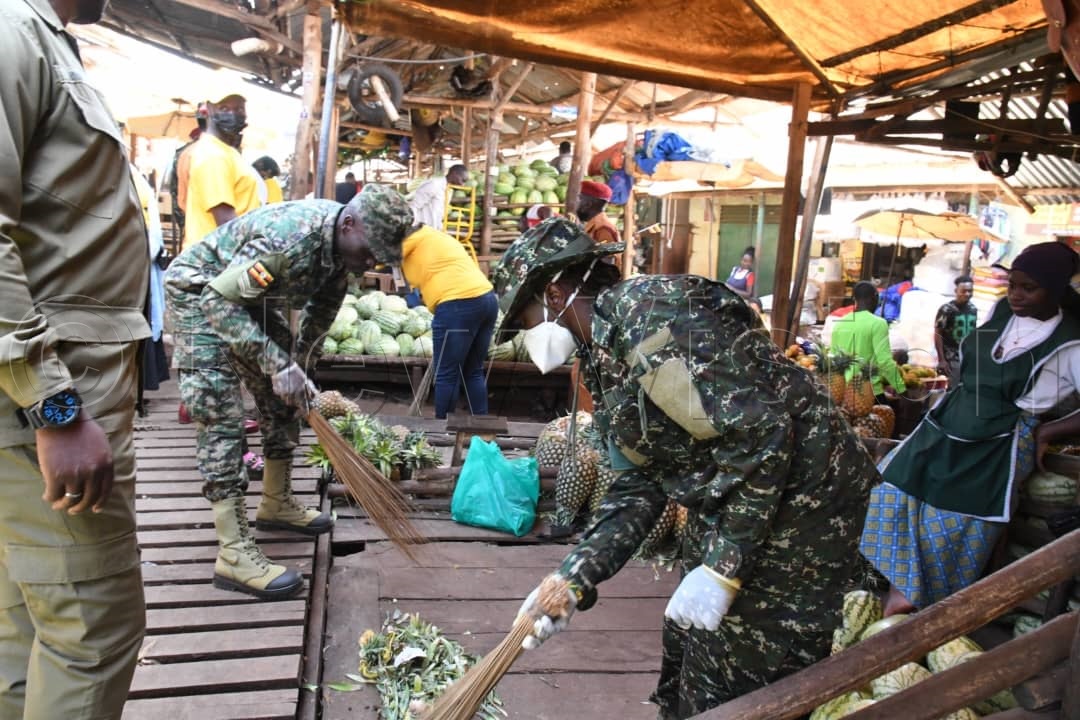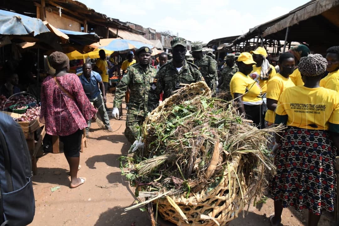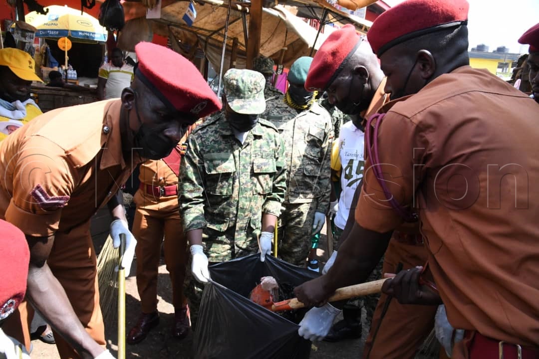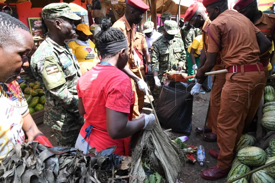 UPDF, Uganda Prisons Service and Uganda Police Force joined by their spouses and children as they cleaned Nakawa market.