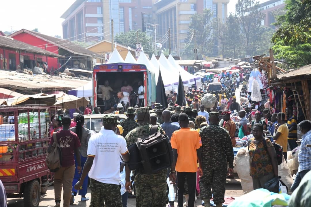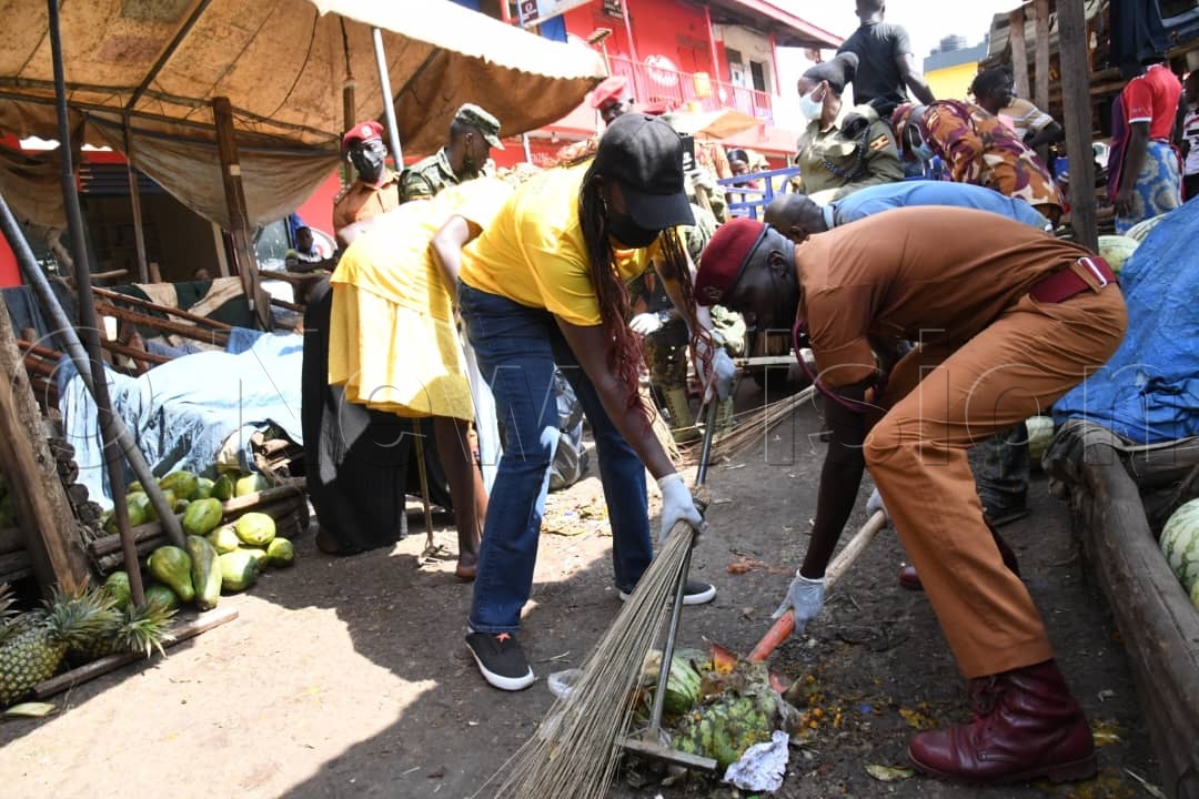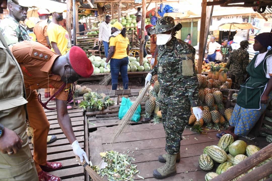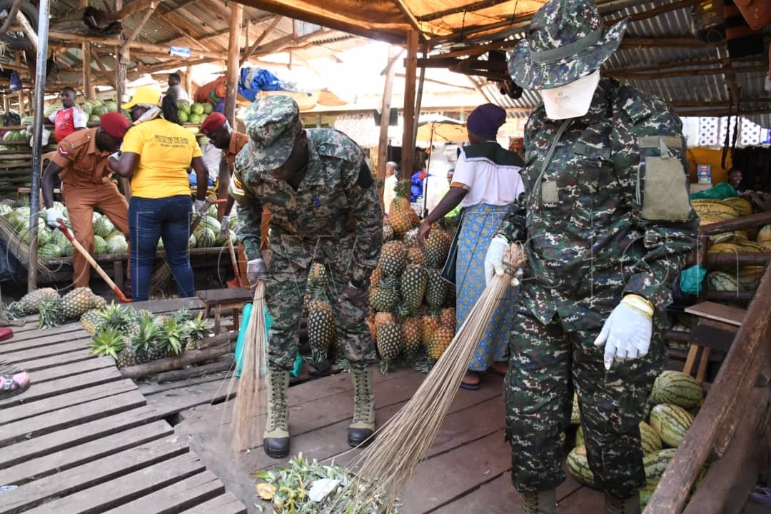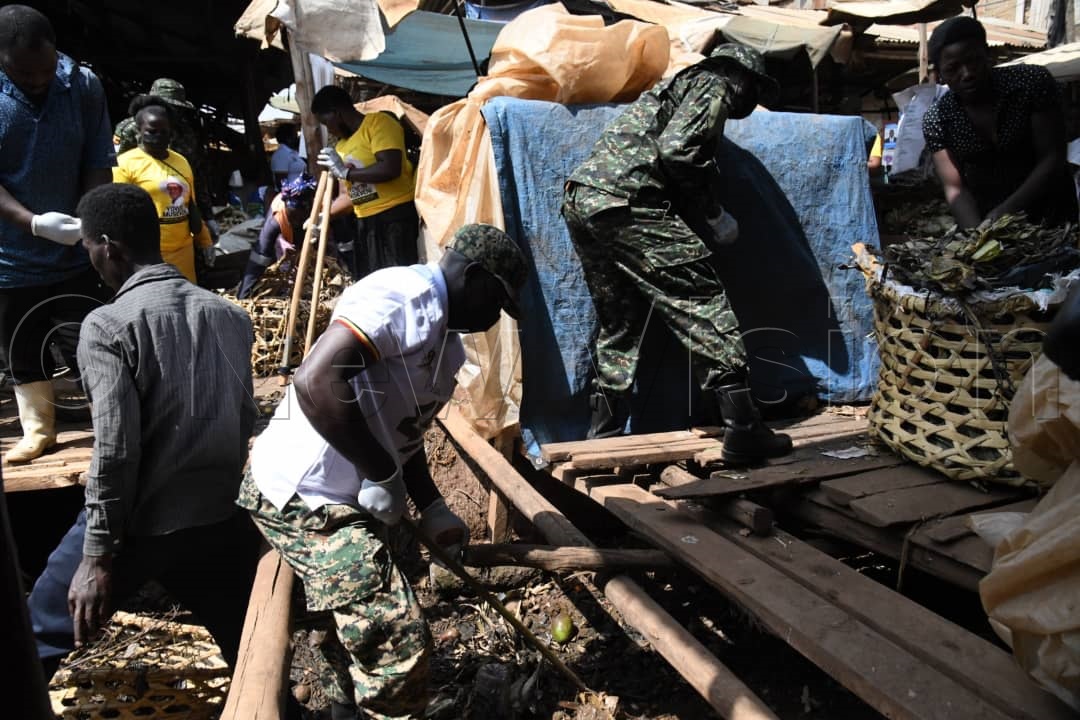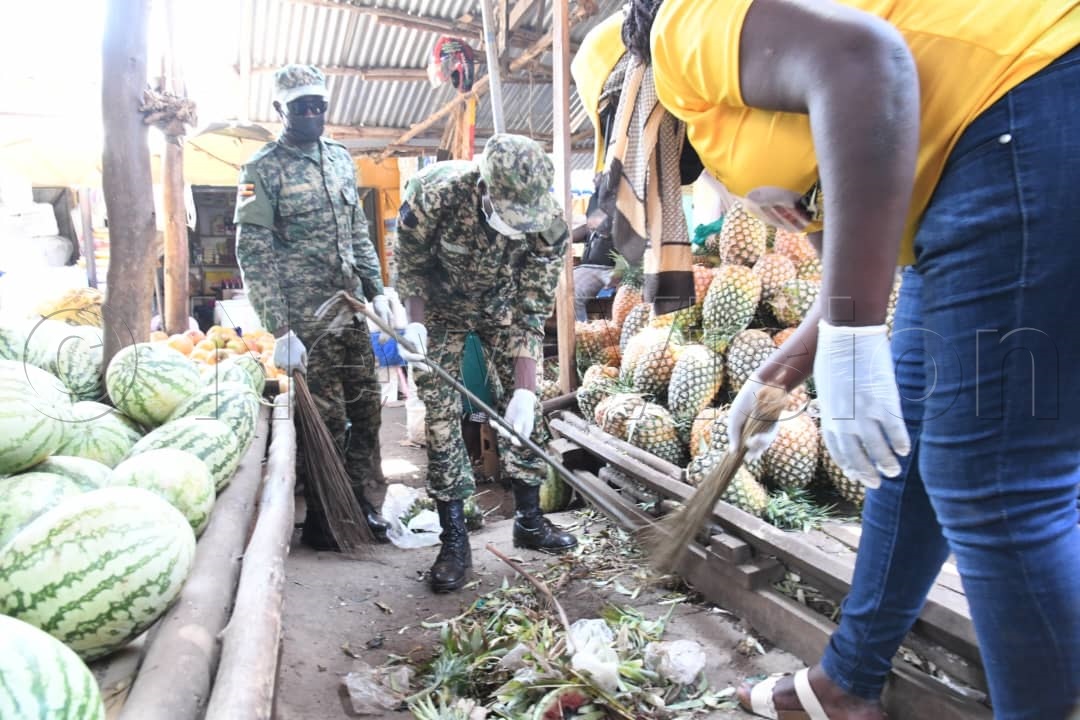 UPDF, Uganda Prisons Service and Uganda Police Force joined by their spouses and children as they cleaned Nakawa market.